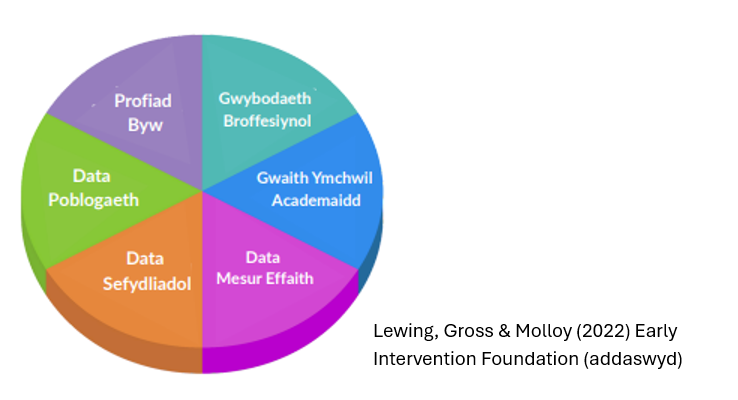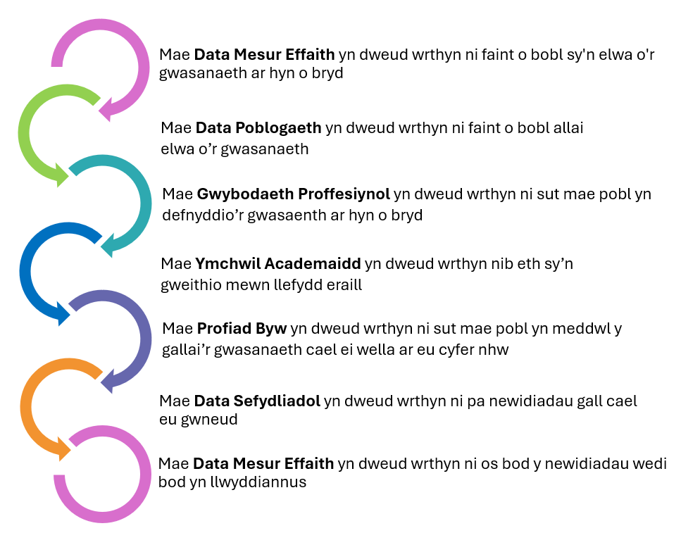 Mae’r CYBI wedi datblygu’r Gacen Dystiolaeth i ddangos y chwe math o wybodaeth sydd yr un mor bwysig ar gyfer llunio penderfyniadau.