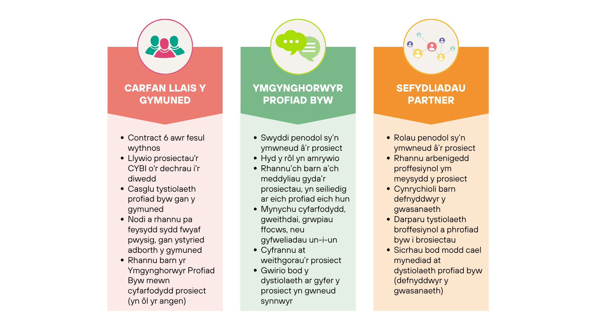 Mae modd i ymgysylltu â’r cyhoedd olygu gwahanol bethau i wahanol bobl. I ni, mae'n golygu cynnwys aelodau o'r cyhoedd a sefydliadau partner yn uniongyrchol yn ein gwaith, gan sicrhau ein bod ni'n defnyddio arbenigedd profiad byw'r rhai yr effeithir arnyn nhw'n uniongyrchol gan y penderfyniadau sy'n cael eu gwneud.Mae ymgysylltu â'r cyhoedd yn bwysig i'r CYBI gan ei fod yn helpu i feithrin ymddiriedaeth rhwng y Cyngor a'r gymuned, mae'n annog cydweithio, ac mae'n sicrhau bod ein gwaith wir yn adlewyrchu anghenion a lleisiau ein cymuned leol. Drwy ymgysylltu â'r gymuned, mae'r CYBI yn gobeithio creu effaith gadarnhaol a pharhaol ledled Rhondda Cynon Taf.Mae digon o ffyrdd i gymryd rhan, ni waeth faint o amser mae modd i chi ei gynnig. P'un a oes gyda chi ddim ond ychydig funudau neu gwpl o oriau rhydd, mae cyfle i chi gael effaith uniongyrchol a chadarnhaol ar waith y CYBI.Sut mae modd i'r cyhoedd gymryd rhan?Un ffordd o gymryd rhan yw rhyngweithio â'r ystod o arolygon ac arolygon barn y mae modd dod o hyd iddyn nhw ar y wefan yma. Maen nhw'n ffordd wych o rannu eich barn gyda ni, llywio gwaith y CYBI, a sicrhau bod y gwaith rydyn ni'n ei gyflawni er budd gorau cymuned Rhondda Cynon Taf. Pam na ddechreuwch chi drwy ddweud wrthym ni beth sy'n bwysig i chi?Os oes gyda chi ddiddordeb neu brofiad penodol yn un o'n meysydd prosiect, mae modd i chi ymuno â ni fel Ymgynghorydd Profiad Byw. Mae Ymgynghorwyr Profiad Byw yn cymryd rhan mewn prosiectau trwy gynnig eu gwybodaeth a'u harbenigedd profiad byw. Am ragor o wybodaeth ar sut i ddod yn Ymgynghorydd Profiad Byw, cliciwch yma.Sut mae modd i sefydliadau cymunedol gymryd rhan?Os ydych chi'n gweithio i grŵp cymunedol, elusen neu sefydliad lleol neu'n ei gynrychioli, yna mae modd i chi gefnogi'r CYBI fel sefydliad partner. Maen nhw'n cynnig ymgynghoriaeth arbenigol, yn darparu tystiolaeth o'r profiadau fel sefydliad, ac mae modd iddyn nhw ein helpu ni i gael mynediad at dystiolaeth o brofiad byw. Am ragor o wybodaeth am weithio gyda ni fel sefydliad partner, cliciwch yma.